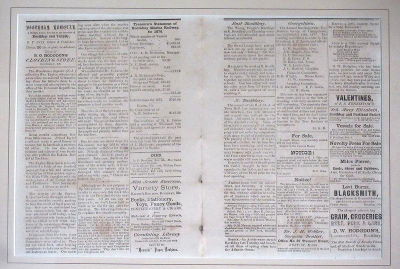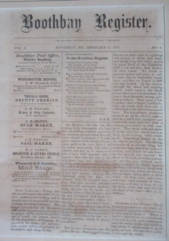 Rhode Island resident Scott Cohoon recently shared the attached photographs of the four-page Feb. 17, 1877 issue of the Boothbay Register which his father purchased at an estate sale "a number of years ago" and it was placed in a frame. "He always admired it," said Cohoon.