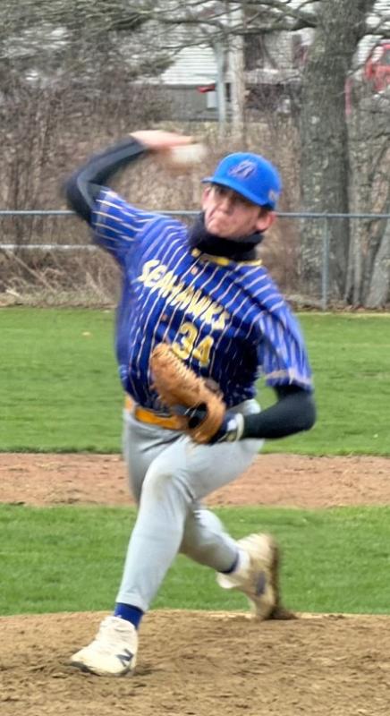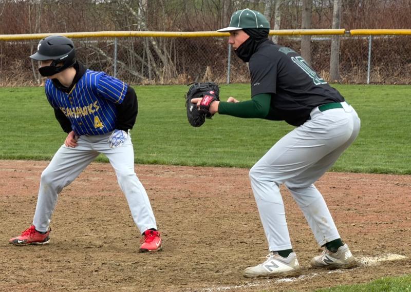 Boothbay starting pitcher Casey Phelps threw 72 pitches in three innings and allowed no earned runs April 22 versus Winthrop. He also had the only hit and run batted in during the Seahawks' 19-1 loss. BILL PEARSON/Boothbay Register