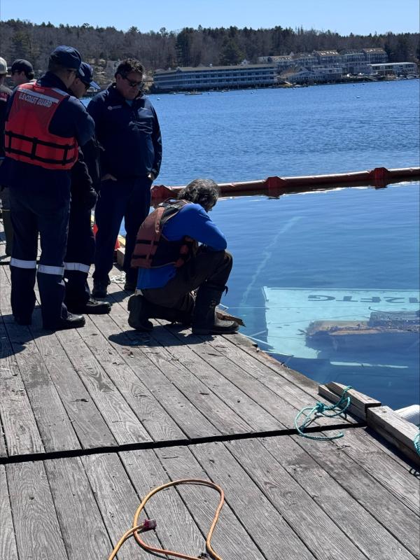 Boothbay Harbor lobster boat sinks, friends helping to raise it at town dock