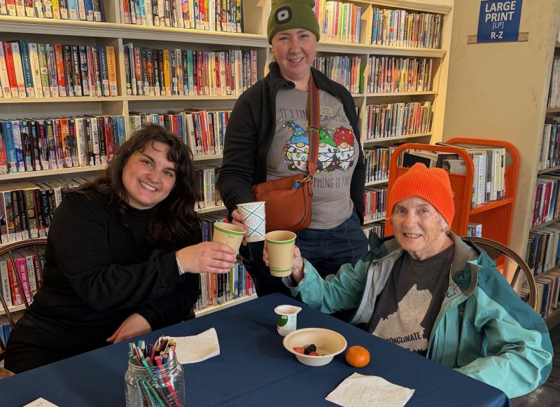 Executive Director Joanna Breen, left, toasts Kjirsten Flores, center, and Jeannie Hamrin Nov. 1 during the first Boothbay Harbor Memorial Library brunch. BILL PEARSON/Boothbay Register