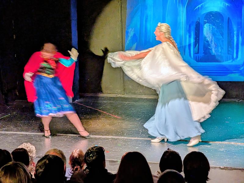 Natalie Flagg’s (Elsa) refined balance in a complex role is outstanding. Both regal and powerful, but unable to control her ice, she voluntarily withdraws into herself to protect the ones she loves, yet longs for them endlessly. Straddling between well-deserved confidence in her vocal abilities in songs like “Let it Go” while holding character as an insecure royal is a tall order Flagg nails. Backed up by the Snow Chorus: Chau Nguyen, Isabel Fanslau, MacKenzie Thyen, Makayla Fairservice, Aryana Gray and Sammy Colby, Flagg shifts effortlessly between the blended sound of a choir and the technical acumen of a soloist.
