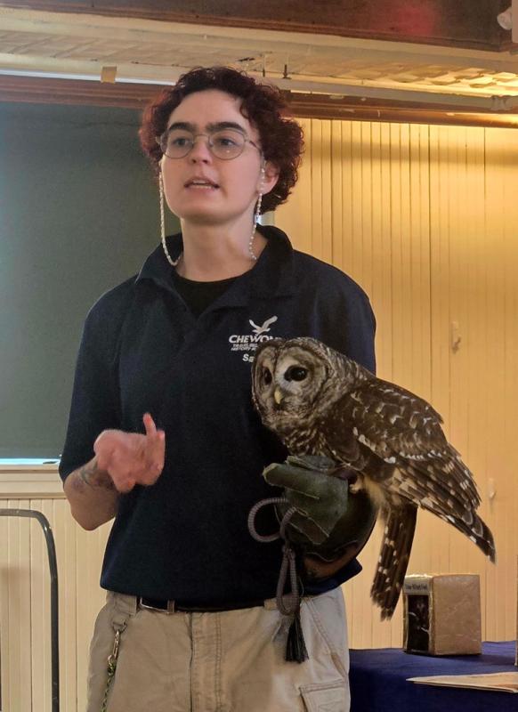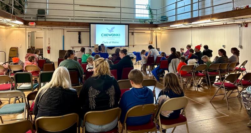 Expertly guided by Sam Cunningham, the science educator at Chewonki’s Center for Environmental Education, families were able to learn the identifying characteristics and calls of each owl through a slide show and demonstration. Then, using talons, wings, and skulls, we explored the adaptations of these silent nocturnal hunters. The program ended with an intimate and detailed look at two live owls, Haven (Saw-Whet) and Luna (Barred), who delighted us all with their big eyes and flapping wings. These non-releasable owls (due to past trauma or injury) are two of the “Education Ambassadors” for the Chewonki Traveling Natural History Program, designed to connect people with nature.