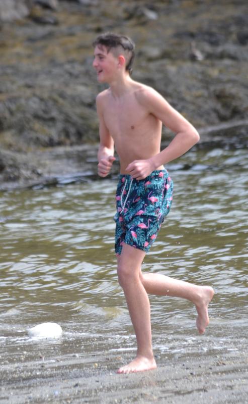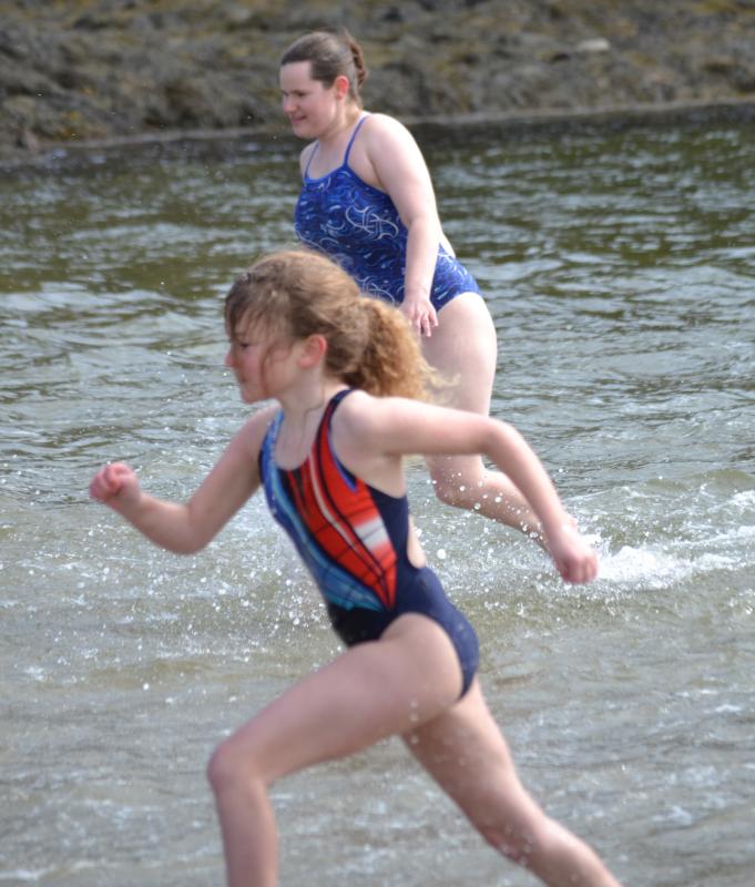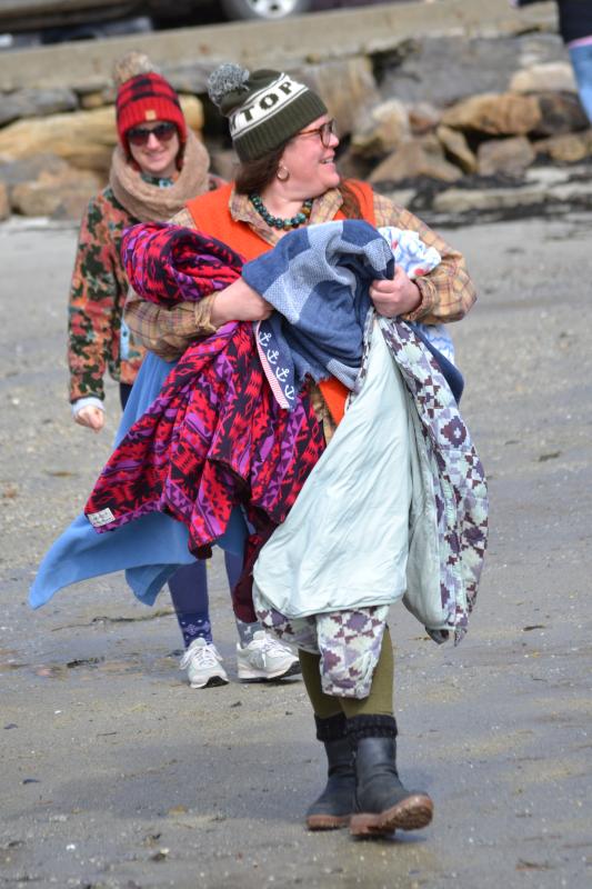 Participants line up and start running down the beach for the 23rd Leprechaun Leap on March 15. KEVIN BURNHAM/Boothbay RegisterAbout 20 brave souls took the initial plunge, followed by about a dozen Little Dippers – the group that relishes the cold water on a regular basis – at the 23rd annual Leprechaun Leap held Sunday afternoon, March 15 at Hendricks Head Beach on Southport Island.