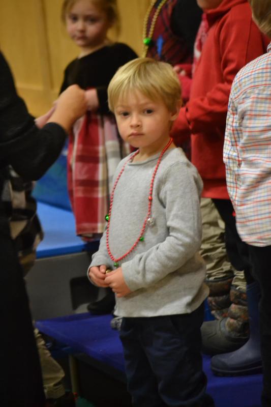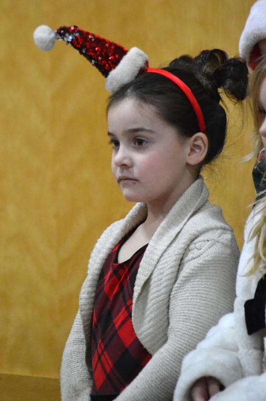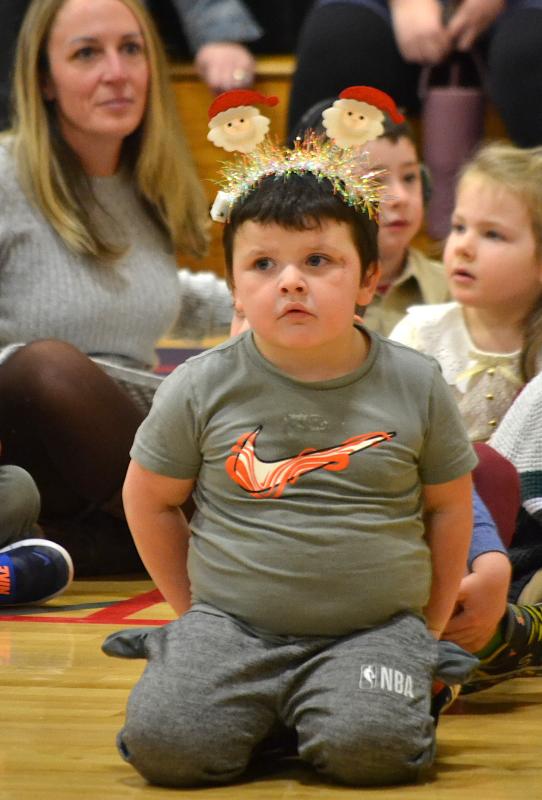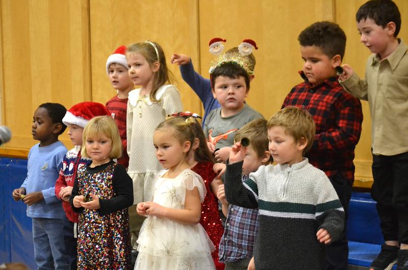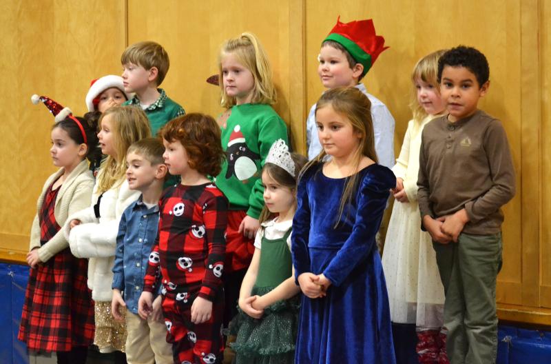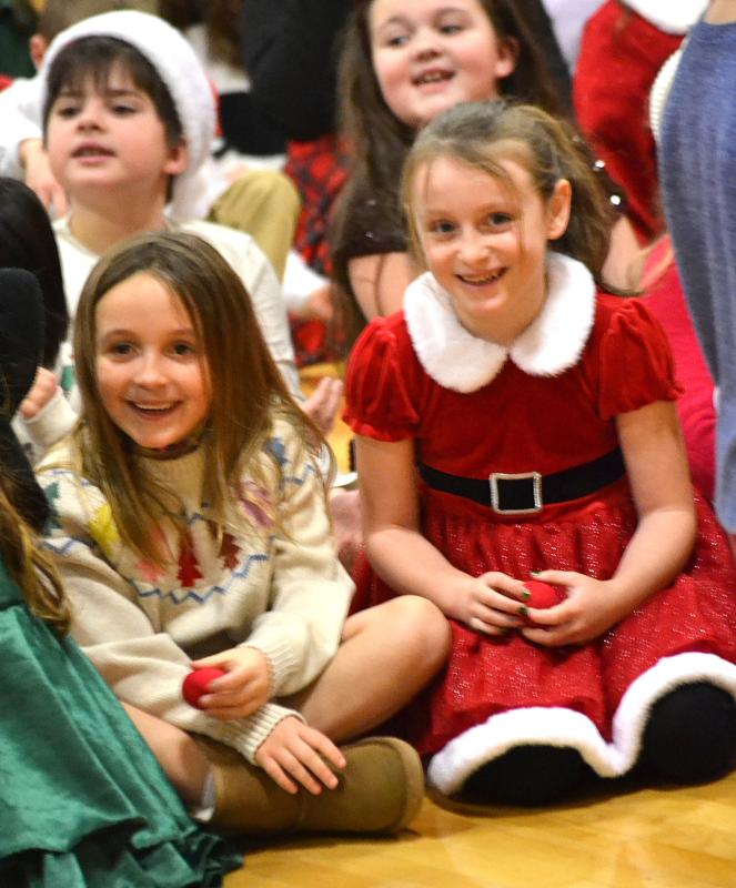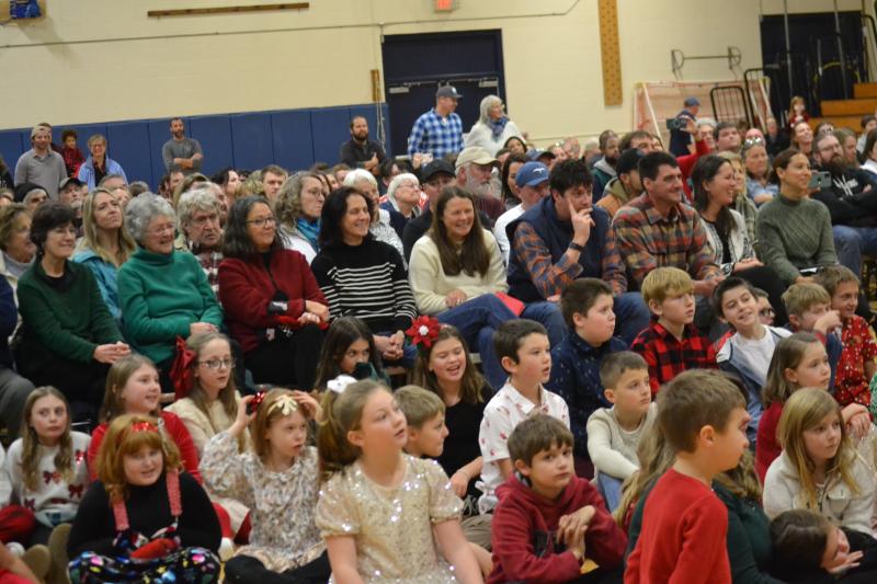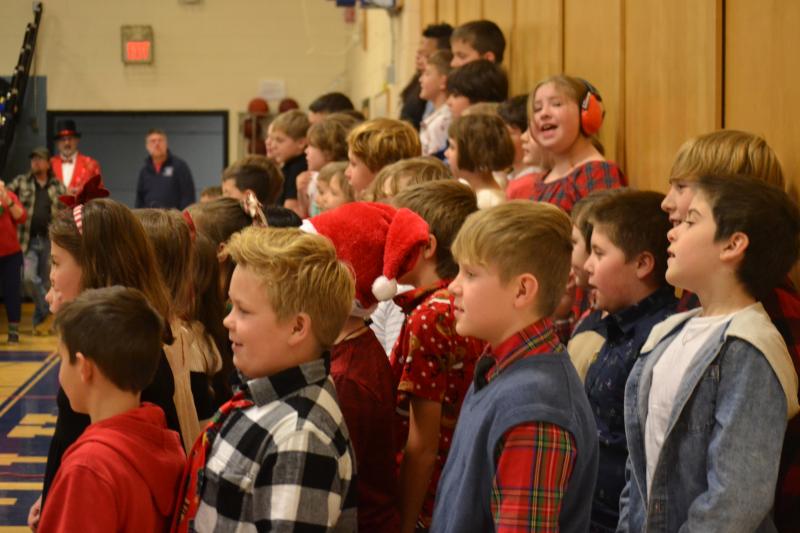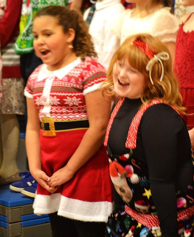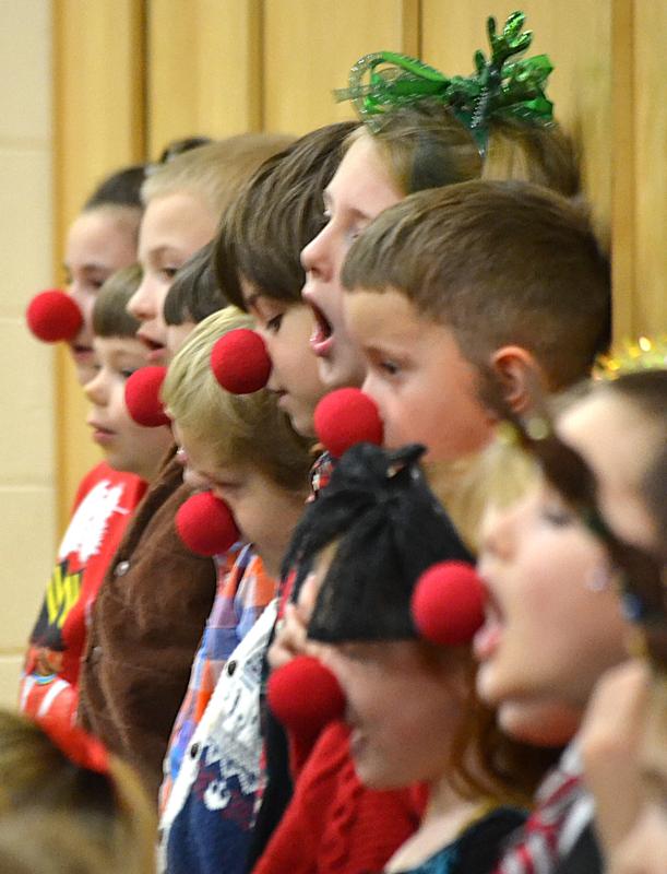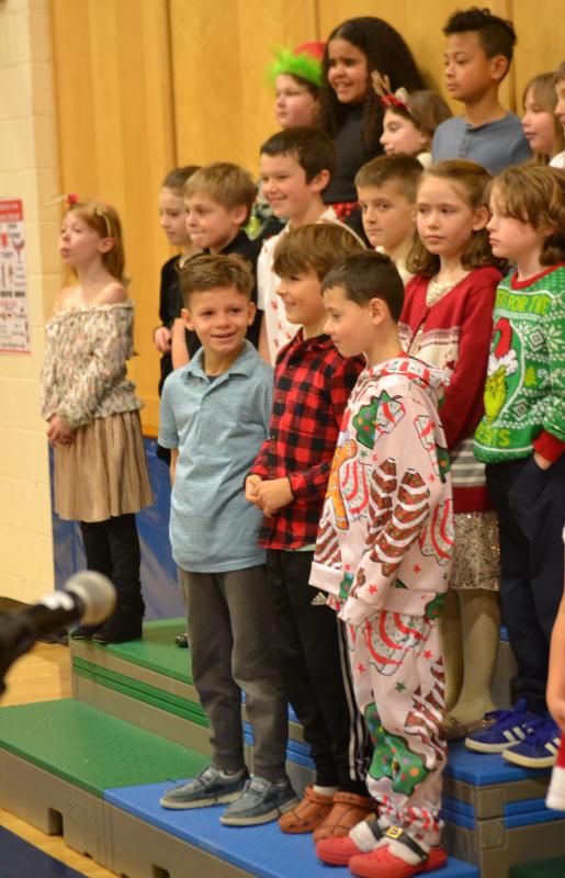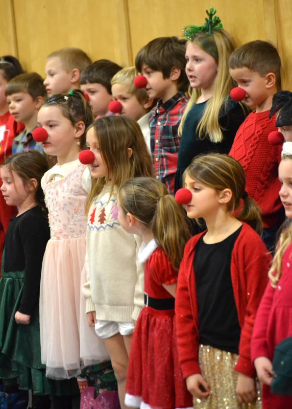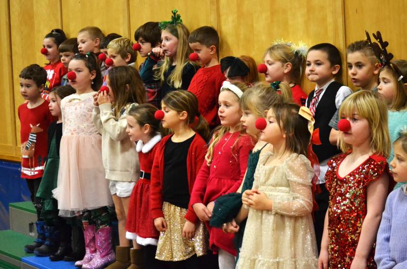 Familiar songs sung by tiny voices, the red and green of Christmas, head (and nose!) adornments, and dozens of happy faces in the front and in the crowd made for a cheerful and fun Holiday Concert put on by the pre-K through fourth graders at Boothbay Region Elementary School Friday, Dec. 19 – the last day of school before winter break. As usual, the BRES gym was packed with parents, grandparents, great-grandparents, other relatives and friends.