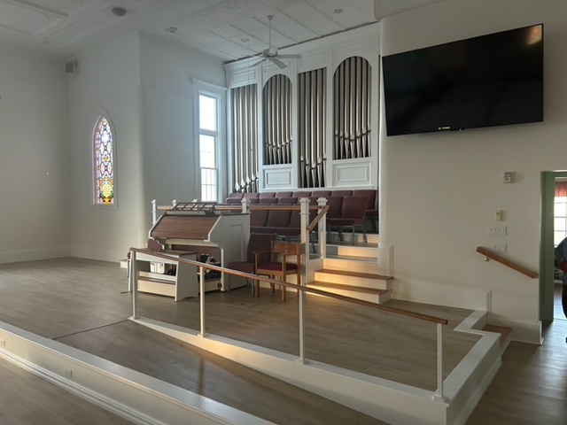 Since COVID in 2021, we had begun hybrid services. We needed much better audio and visual upgrades. An AV committee was formed to review all the different possibilities. The carpeting in front was old and stained. While the sanctuary looked beautiful, it was no longer functional, but we were keenly aware that we had to preserve the sanctuary’s historic character.