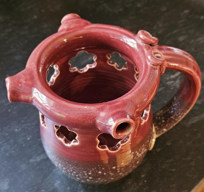 One hot and sunny July afternoon, a person went snorkeling in Long Lake near Harrison, Maine. On this excursion they discovered something quite unusual at the bottom of the lake. The item appeared to be some kind of mug glazed in green and tan earthy colors. It was not an ordinary mug as it appeared to have strange holes around the area one would normally consume a beverage. Upon further inspection, they noticed the bottom of the mug was labeled “Dirty Bird Pottery.” They began searching online and learned that it came from a pottery studio that had once occupied the bank building in downtown Boothbay Harbor, Maine. This work turned out to be one of Julie Moore’s Puzzle Mugs!