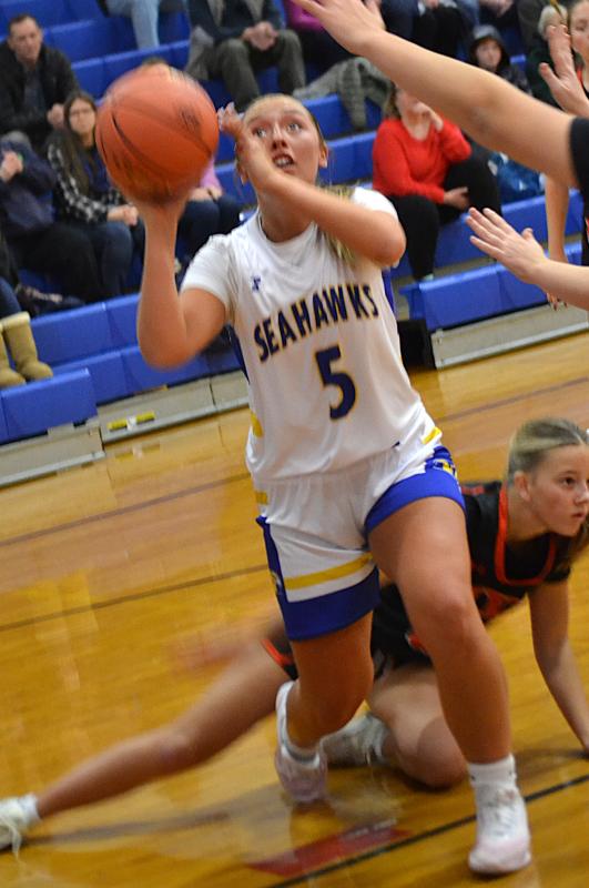 Senior co-captain Tatum French had one of the best scoring games of any Boothbay Region High School female basketball player, amassing 39 points – 16 in the first quarter – to lead the Seahawks to a 61-33 win over the visiting North Yarmouth Academy Panthers Tuesday night, Dec. 9.
