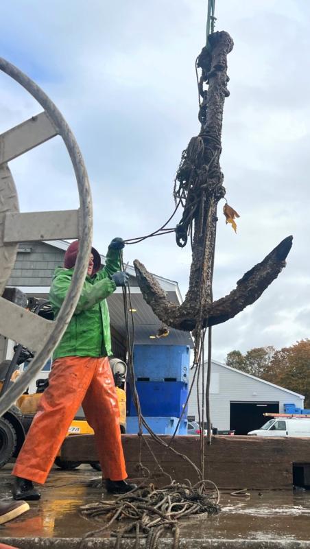 Devyn Campbell hauls in a 600-pound anchor he found during ghost gear removal. Courtesy of Devyn Campbell