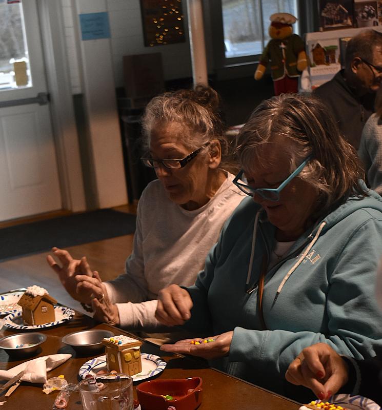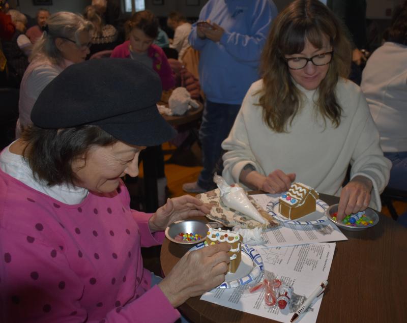 Ellie Perry of Damariscotta brought her granddaughter Evie Magaro of Bremen along. Like the others, they were completely absorbed with the decorating, carefully piping white icing on their ginger roofs. Evie was finishing up to get to a rehearsal of the Lincoln County Community Theater production, “The Best Christmas Pageant Ever.”