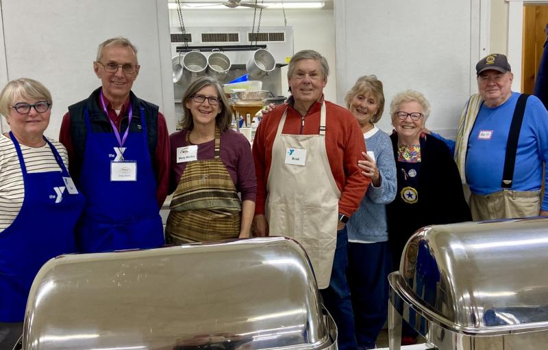 Throughout the four hour meal, and in two shifts, volunteers from the Boothbay Region YMCA, the Boothbay Region Food Pantry, the American Legion, and the Legion Auxiliary served, cleared plates, sliced and served desserts, and chatted with the 122 guests who came to enjoy dinner. There were over 30 “to-go” boxes that went to others in the community who were not able to come to the Legion Hall. Then all of the leftover food, rolls, and desserts, including one whole turkey, were wrapped up, dated, and delivered to the 24/7 Community Fridge managed by the Community Resource Council (CRC). Some guests brought food in lieu of donations for the CRC’s Community Fridge. All in, the total amount of money donated was a whopping $1,787.