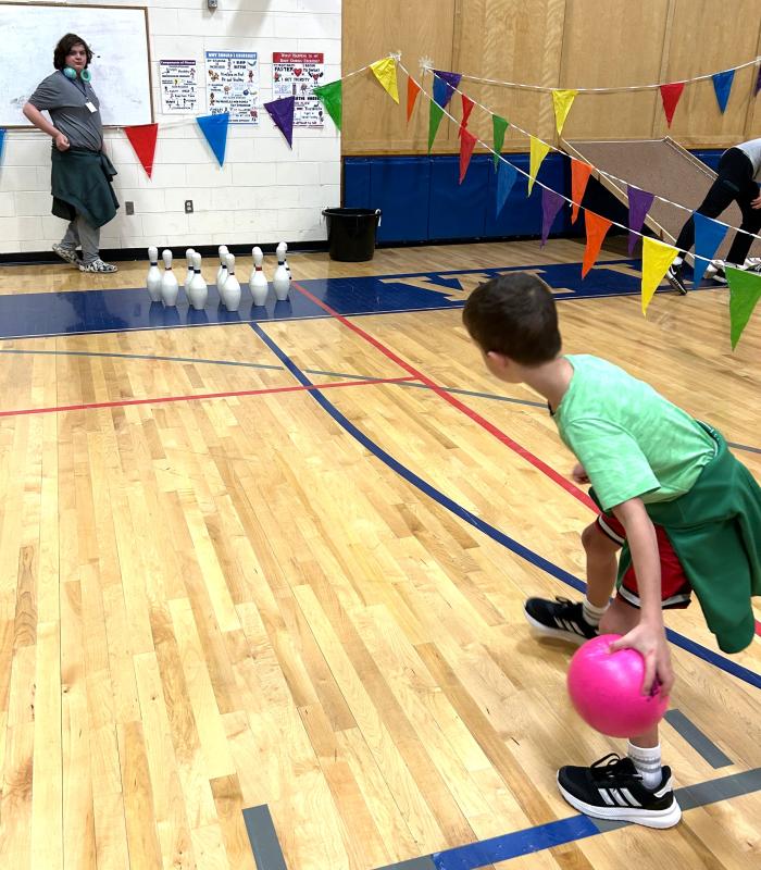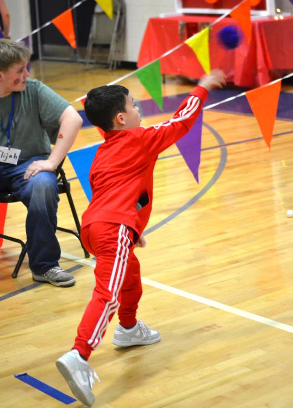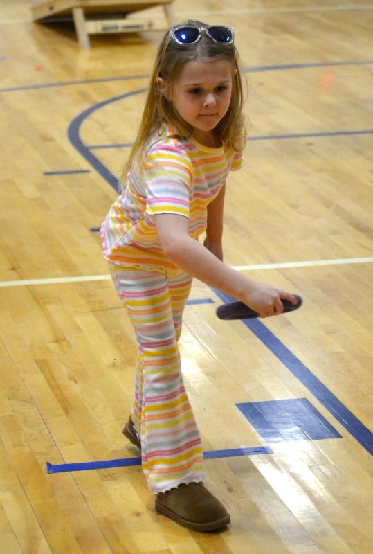 Going for a strike at one of the game stations during Carnival Night April 8 at BRES. KEVIN BURNHAM/Boothbay Register