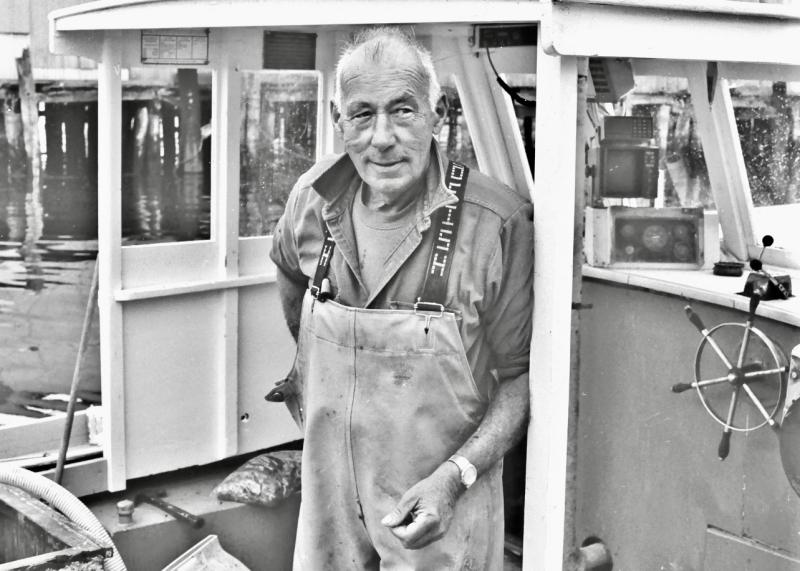 During our chat, we got off track somewhat andinitiated some conversation about an old photograph I had made of Craig Sproul’s lobster boat, Cutter II, cruising across the Harbor amidst a significant gathering of sailing vessels during Windjammer Days of about 40 years ago. Matt liked the photo well enough to ask that I make a print for him, which I am happy to do. We reminisced about some of the “old timers” who Matt looked up to, many of whom I got to know as well. One such individual was Captain John Begin, aka “Old Horse.” Matt had some good stories to share and I was reminded of the time I photographed him with John for Charles Kuralt’s book “America.” Charles had interviewed John and several water-basedfolk like Bud Brackett, Gib Philbrick, Ken Brown and others. Not all the photos made it into the book but some of the conversations Charles had, did. One conversation with John Begin, regarding a serious experience he’d had during a severe storm offshore, was included. I’d like to share a portion of that conversation from the book.