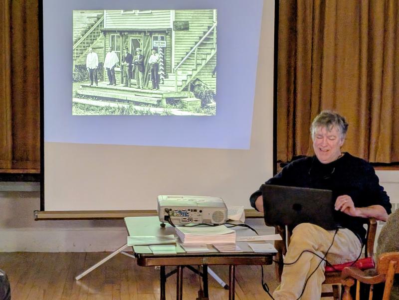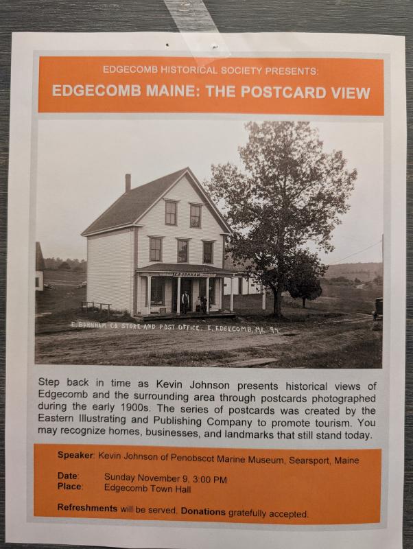 Kevin Johnson, author and photo archivist for Penobscot Marine Museum (PMM), presented a slide show of antique postcards to a gathering of about 50 people, Sunday, Nov. 9, at Edgecomb Town Hall. The first half of the presentation included lively stories of Johnson’s and the collections' several twists of fate before landing at their current PMM locations. In the second half of the presentation, Johnson sought audience feedback in identifying buildings, people and perspectives of the Edgecomb images. Many attending were able to contribute historical context surrounding the images, including structural changes to buildings and homes, family names belonging to the structures, businesses and residences that no longer exist, and at least one engaging story of the legendary "Marie Antoinette House," including a supposed piece of fabric believed to be from one of her dresses.