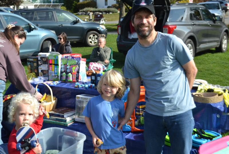 While Andrews and Goodwin have participated in several yard sales, Christopher Desjardins attended his first Post 36 American Legion Yard Sale. Desjardins is from Burlington, Vermont. He is visiting his brother and had some free time. So he brought his son to Boothbay Common.