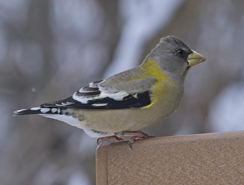 A female-plumaged evening grosbeak showed up in the authors' neighborhood recently, part of a wave of evening grosbeak sightings across the state. Wikimedia Commons courtesy of Mykola Swarnyck