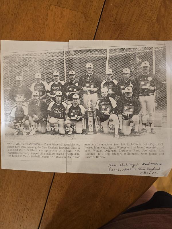In 1986 Chuck Wagon/Steve’s Marine won the Rockland “A” division modified pitch softball title. They then moved on to the state tournament and beat Lapointe lumber in the state final. Their next tournament was in Keene, New Hampshire where they won the New England Championship.