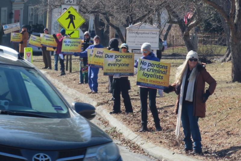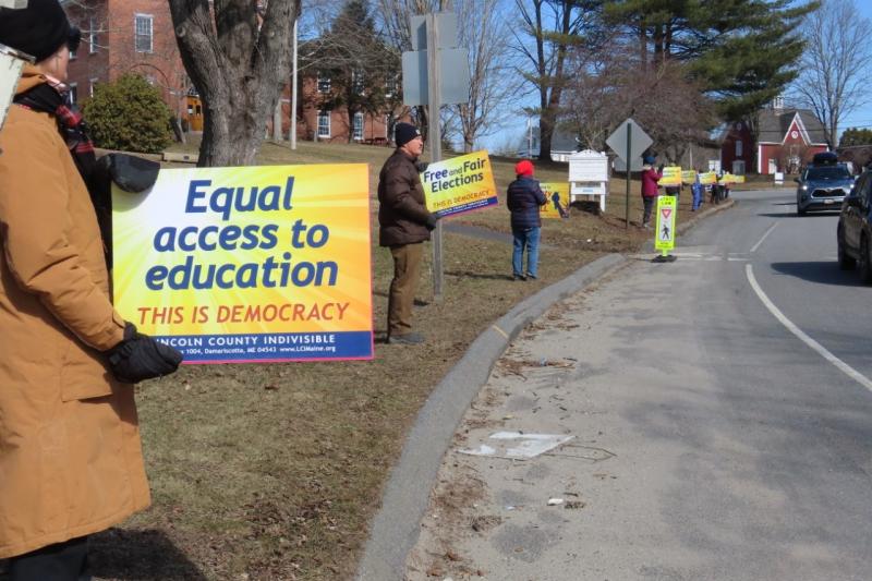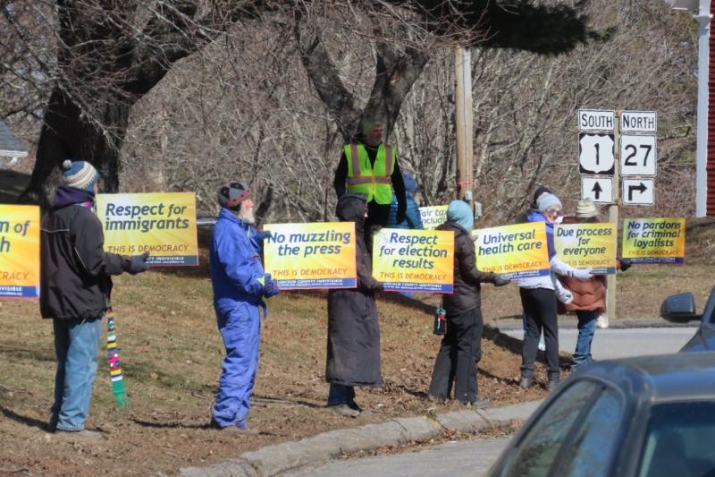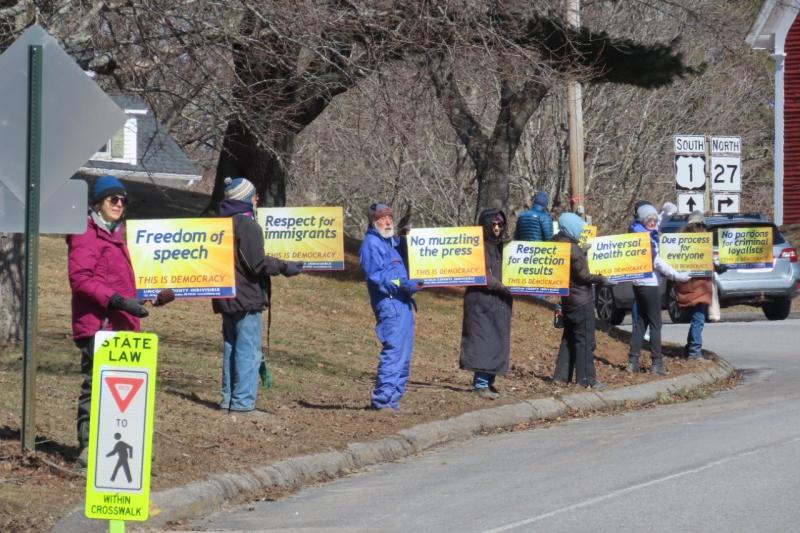 In Wiscasset, Lincoln County Indivisible deployed its ‘Signs of Democracy’ on the approaches to the bridge. This is a set of signs which express core aspects of a functioning democracy, all of which are currently under threat. Such things as ‘free and fair elections’, ‘no voter intimidation’, ‘respect for election results’, ‘no pardons for criminal loyalists’, ‘due process for everyone’, ‘respect for immigrants’, ‘no arbitrary ICE abductions’, ‘protecting LGBTQ+ rights’, and ‘no corruption in government’. In all, there are 24 unique signs in the set.