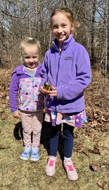 Emma Duncan, 7, of Old Orchard Beach, found the second golden egg. Here she is, on the scene, with younger sister, Callie. Lori Bailey photo