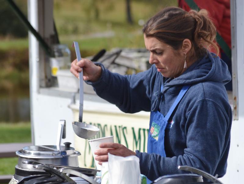 While Elaine Rittershaus might have been done shopping, she wasn’t totally done, as she stopped by Morgan Mills BBQ for a cup of smoked finnan haddie chowder, which, of course, husband Chuck had to try a spoonful.