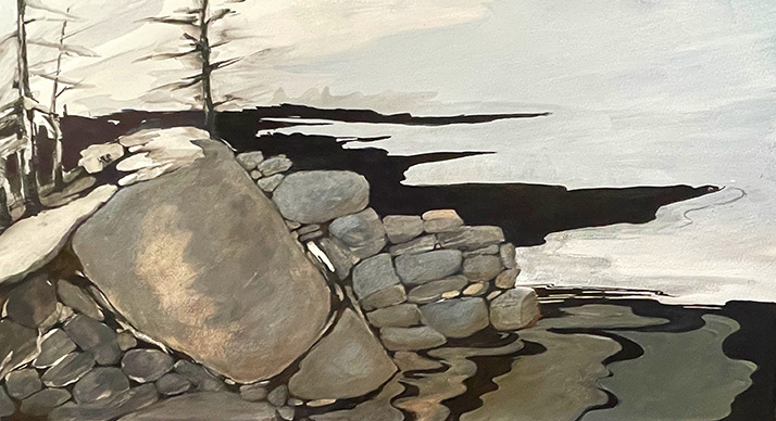 Of late, Pam has come to view her work as being rather “blunt.” No frills, not hidden in abstraction, just put down in imagery using basic mediums. From the interpretation of Maine coastal landscapes to the time worn stuff of life dotting the wharves and harbors of Friendship, the narrative emerges. Extending to self-reflection and immersion in her coastal life, that narrative hopefully serves to shape works that stand alone with no further words necessary.