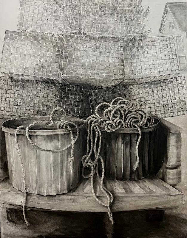 “Friendship Inspired” is a collection of works by this well respected Maine artist born of her life in the fishing village of Friendship, Maine. Works range from large format paintings in acrylic and charcoal to small sgraffito on porcelain works emblematic of coastal Maine.