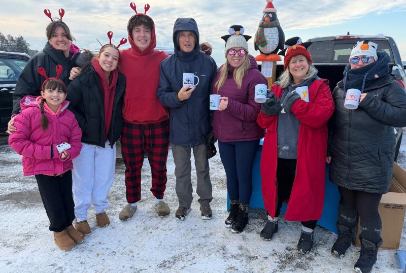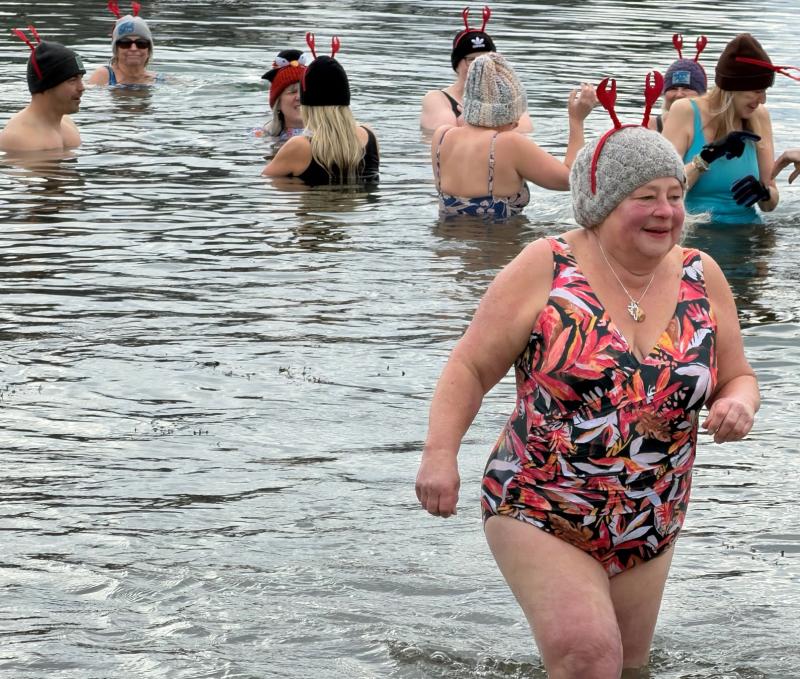 Several members of the Little Dippers participated. The Little Dippers began about five years ago beginning with a few members to now with about 30. The Little Dippers take a swim at Hendricks Head Beach every day. Pam Baldwin is one of the Little Dippers who joined the annual Penguin Plunge.