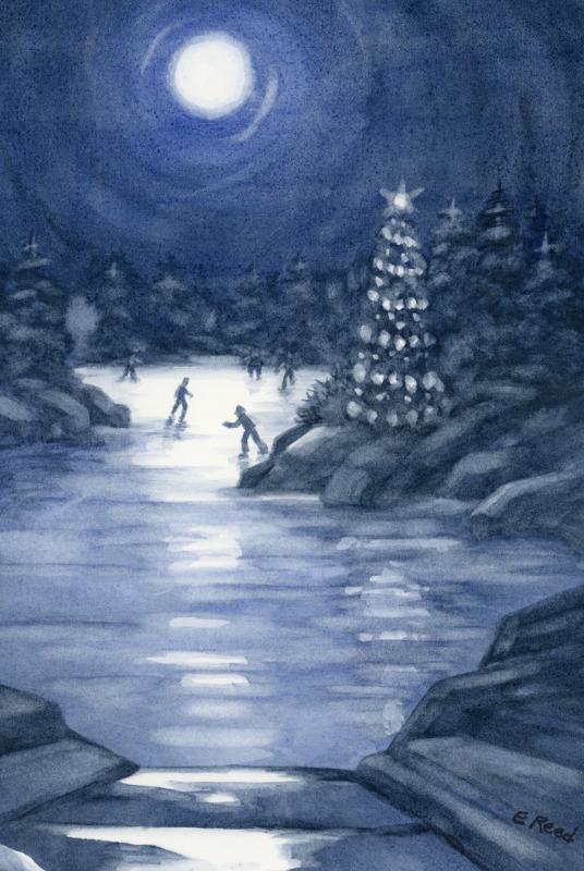 Elaine Reed’s “Moonlight Magic in Maine” Pine Tree Society holiday card captures the awe of a winter night under the light of a full moon. Skaters on Nequasset Lake in Woolwich glide across the ice surrounded by brilliantly lit snow and a magically illuminated tree topped by a star; 100% of proceeds from sales support Maine people with disabilities. Holiday cards can be ordered at www.pinetreesociety.org
