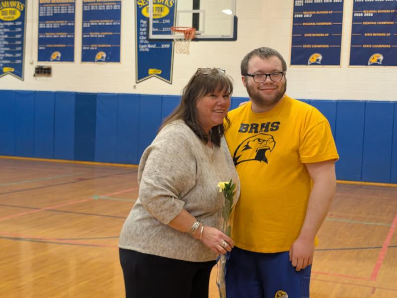 CANDI JONETH/Boothbay RegisterThe Boothbay Region High School (BRHS) Seahawks lost to the Hall Dale Bulldogs in their final regular season game, Tuesday, Mar. 3, 75-69, in Unified play. The Seahawks honored four seniors: Anthony Angelico, Zander Blake, Caiden Farmer and Chloe Joneth.