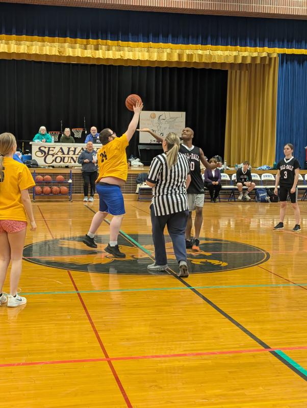 Partners Ronan Drage, Eleanor Marshall, Aryana Gray, Arabella Hodgdon, Sarah Harris, Moriah Smith, Zuriel Smith and Maddie Andreasen loaded the Seahawk bench and provided on-court assistance. Their contributions, along with those of Cole Hyson (absent), have made the season possible in countless ways. Unified basketball is a community-level extension of Special Olympics Maine Unified Championship Club, which promotes leadership, friendship and social inclusion for student-athletes with and without disabilities.