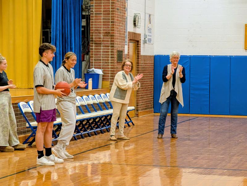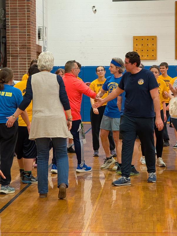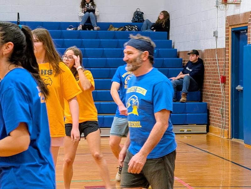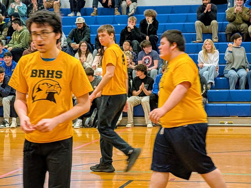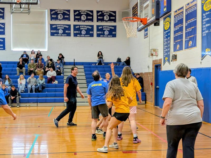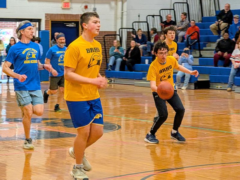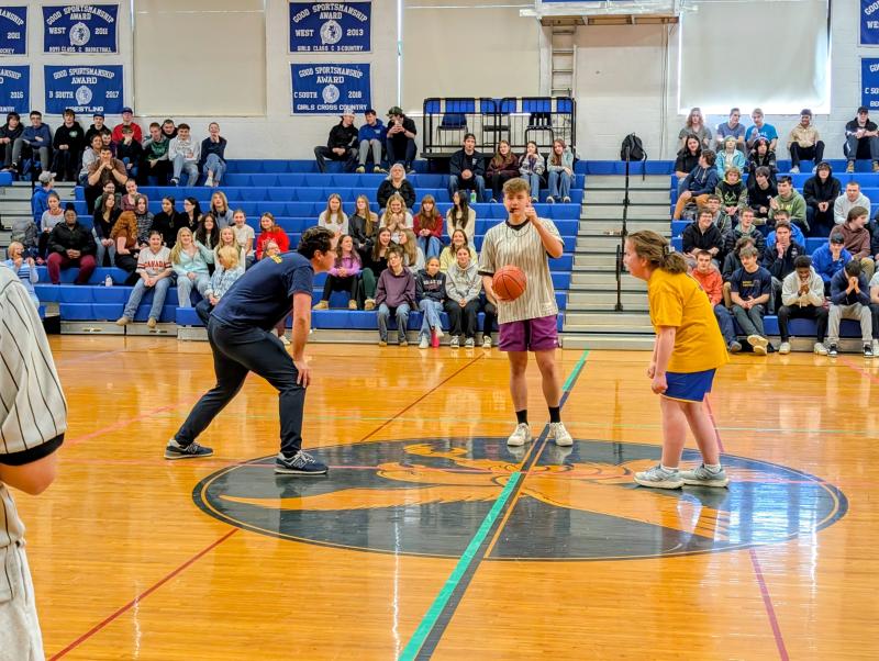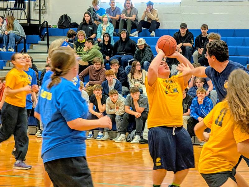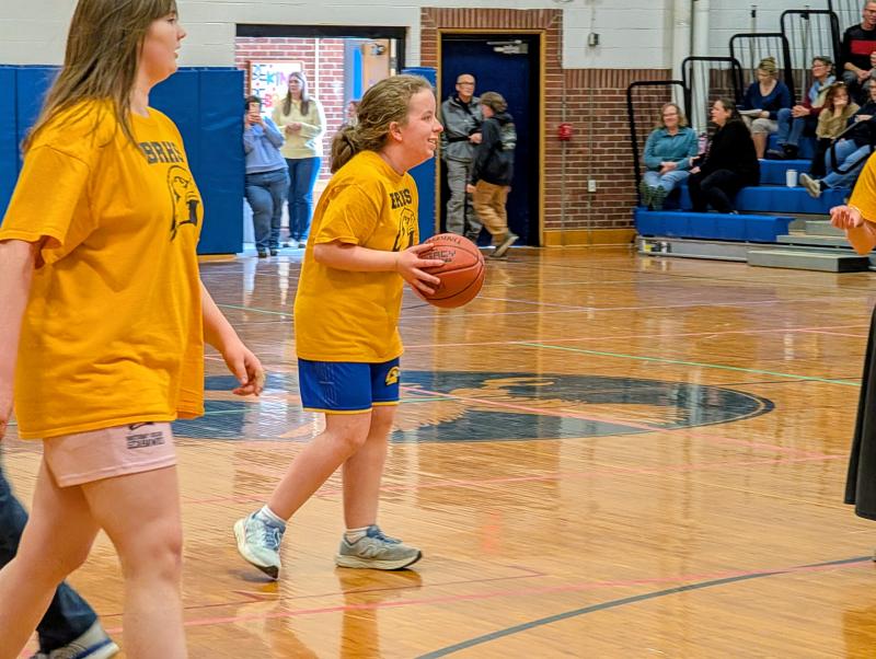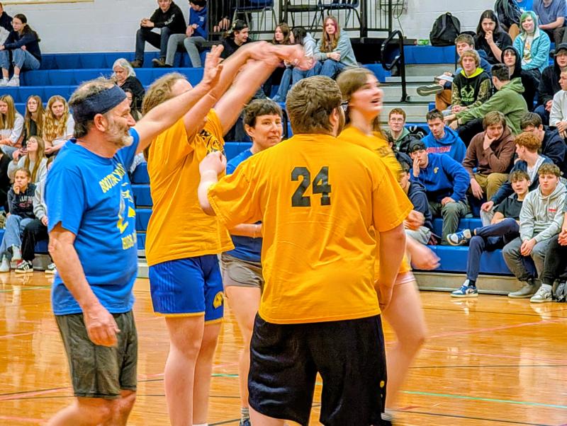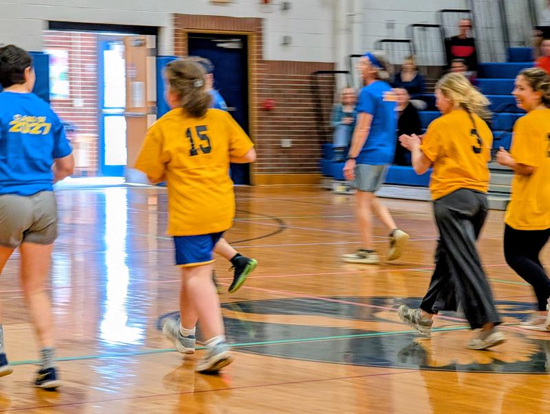 CANDI JONETH/Boothbay RegisterBoothbay Region High School (BRHS) Unified basketball beat the BRHS faculty 51-41, March 25, in a rousing midday exhibition game. March Madness rocked Porter Memorial Gymnasium as the Seahawks eased into their game against their teachers, who looked less confused this time around. Mike Cherry, 6’7", perhaps Maine’s tallest English teacher, tipped off the matchup against 5’3 senior Chloe Joneth. Cherry scored the first bucket of the game, which was the last time the faculty led.