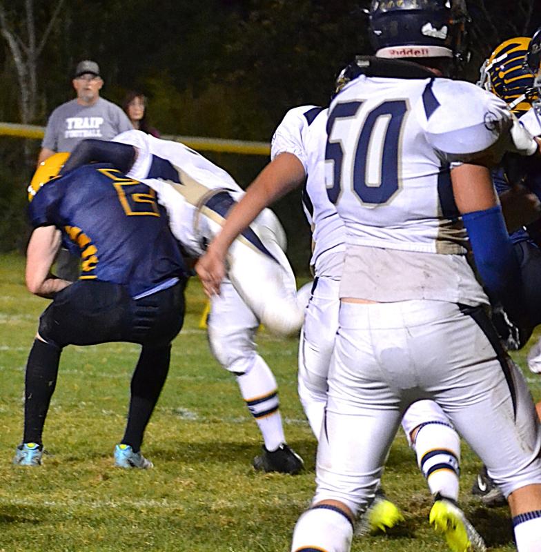 "They sent me in there on a blitz, and I made the tackle," Gamage said. If the safety was the first half highlight then the low-light also happened in the second quarter. With Boothbay trailing 8-0, the offensive unit illegally aided a runner into the end zone using the play known as the "Tush Push" where teammates push the pile along with the runner. Boothbay was penalized five yards and failed to score with the ball on the Traip one-yard line.