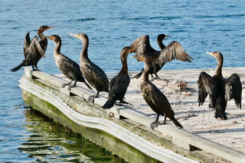 These critters have always fascinated me, especially when they hang out on a float or piling or mooring ball. I always thought they had a sort of prehistoric look to them, similar to the pterodactyl, I think that’s the correct reference, especially when seen out of the water with their wings spread, drying their feathers. Of course, flatlander that I am, I had no idea what the reason for this was. I figured they were just airing out after a long day. But Google tells me it's because their feathers are not waterproof, so after swimming around or under water for a period of time, they need to dry off their wings so they can fly. Duh, who’d of thunk?