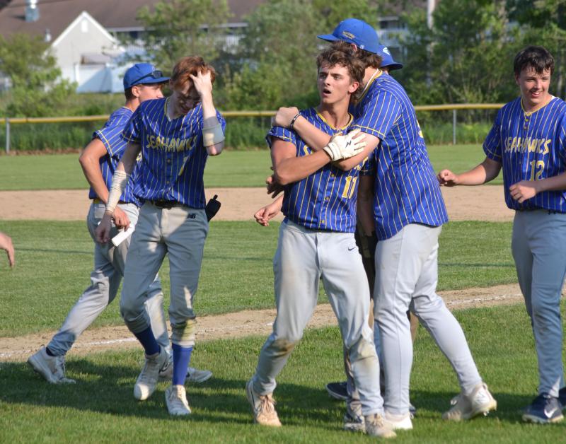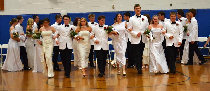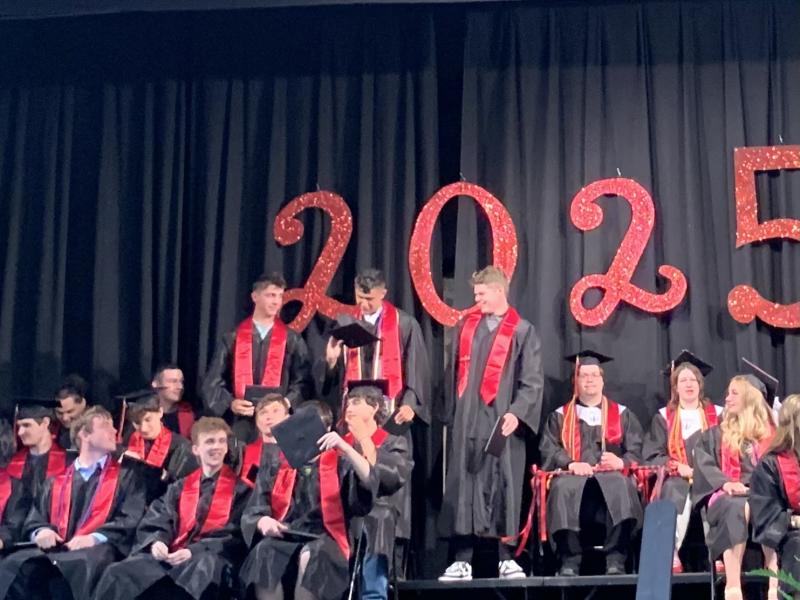 Some of their seated classmates look on as three graduating Wiscasset Middle High School seniors share a moment June 5. SUSAN JOHNS/Wiscasset Newspaper