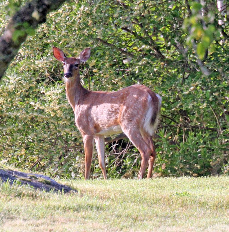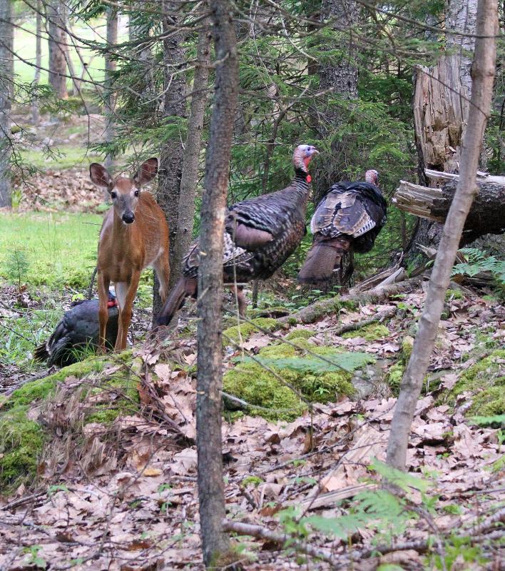 At two locations on the Boothbay peninsula in June, these deer — and subsequent photobombing strutters, aka, turkeys — were captured on camera. STEVE EDWARDS/Boothbay Register