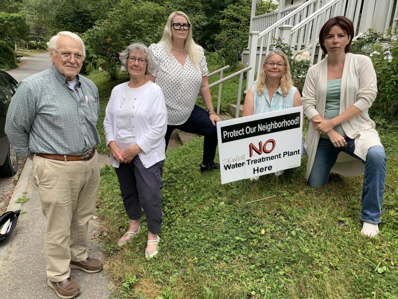 From left, John Davis, Jane Johnston, Amanda Dawnrich, Tanya Hammond and Shannon Babcock, pictured Aug. 29, are fighting putting the sewer plant where public works is now. SUSAN JOHNS/Wiscasset Newspaper
