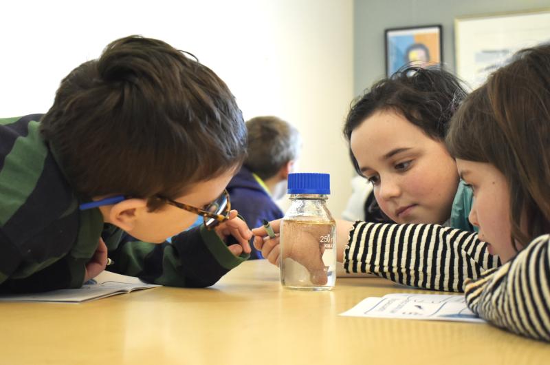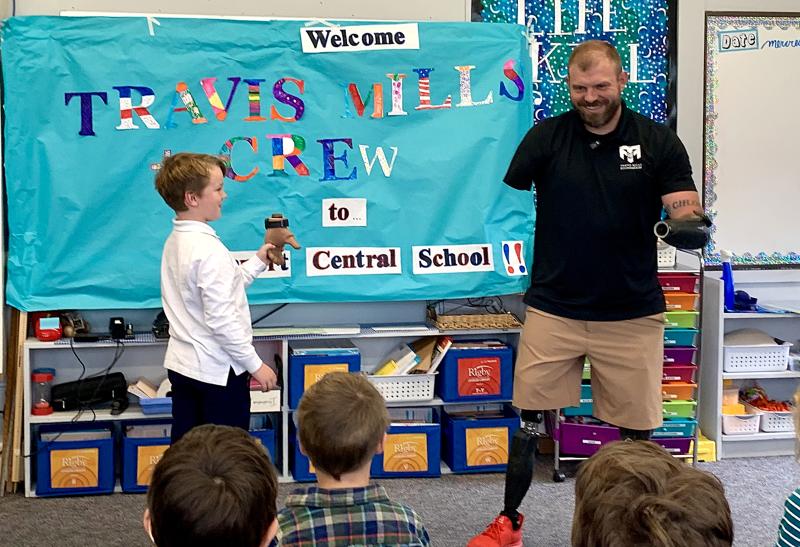 Travis Mills shows off his prosthetic's detachable hand function with the help of a Southport student. ISABELLE CURTIS/Boothbay Register