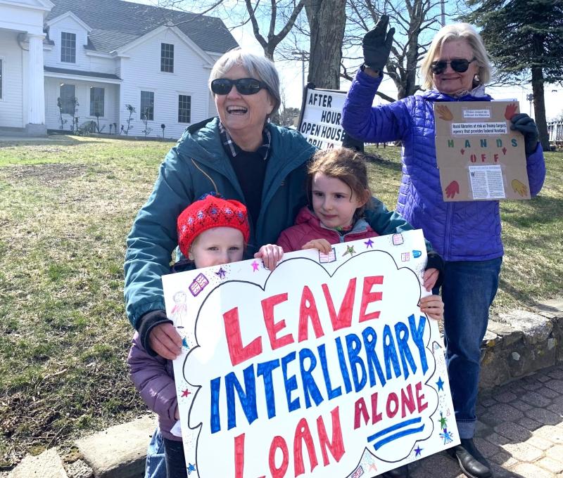 Rita Arnold and her granddaughters, June and Faye, protest the federal funding cuts to libraries nationwide. ISABELLE CURTIS/Boothbay Register