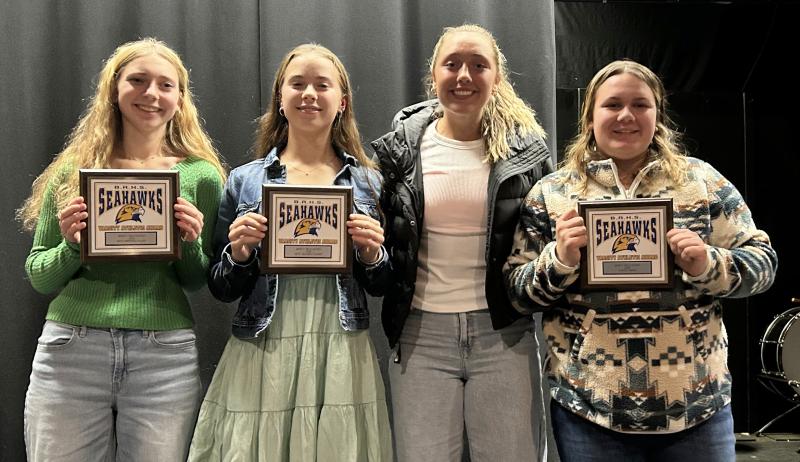 2025 BRHS field hockey award winners were, from left, Sophia Gatnar, most improved player; Moriah Smith, most valuable player; Tatum French, most valuable defensive player; and Ella Watts, coaches award. KEVIN BURNHAM/Boothbay Register A celebration of one of the best seasons a Boothbay Region High School field hockey team has ever had – the second best in 50 years, according to BRHS records – was held during the 2025 awards night Thursday, Nov. 20 in the BRHS auditorium.