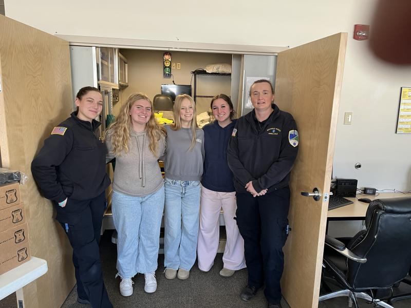 Welcoming Boothbay Region High School students to the Boothbay Region Ambulance Service station are EMT Emily Densmore, left, and Chief Kristen Roberts, right. The students are, from left, Addie Barter, Arabella Hodgdon and Eleanor Erwin. Larry Brown photo