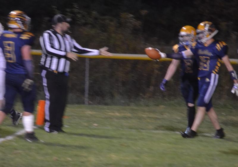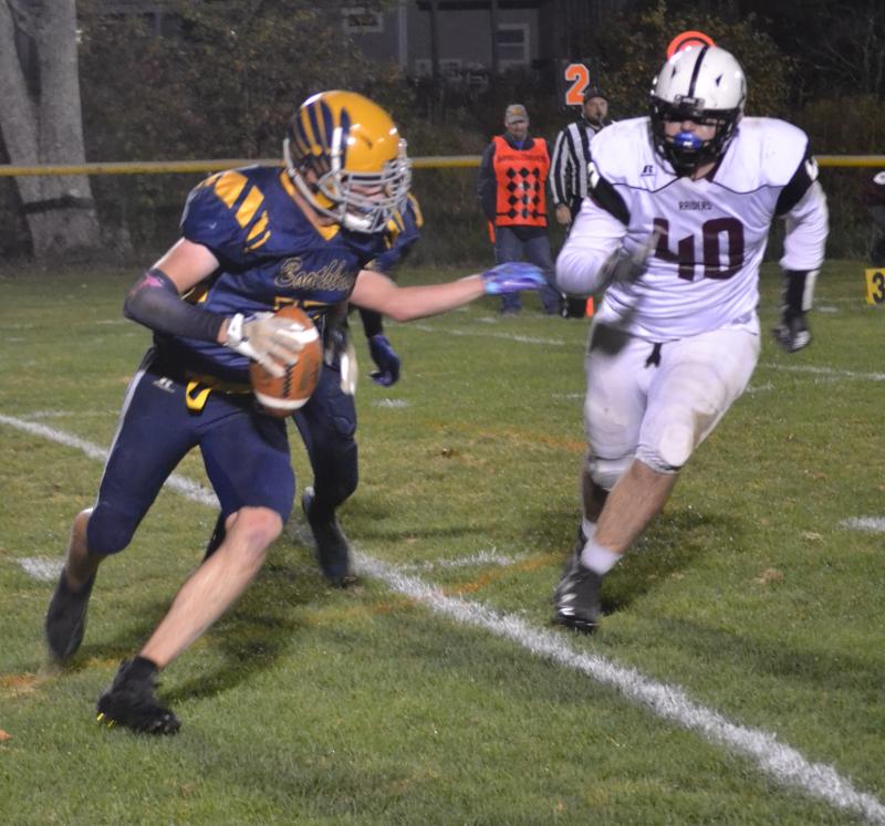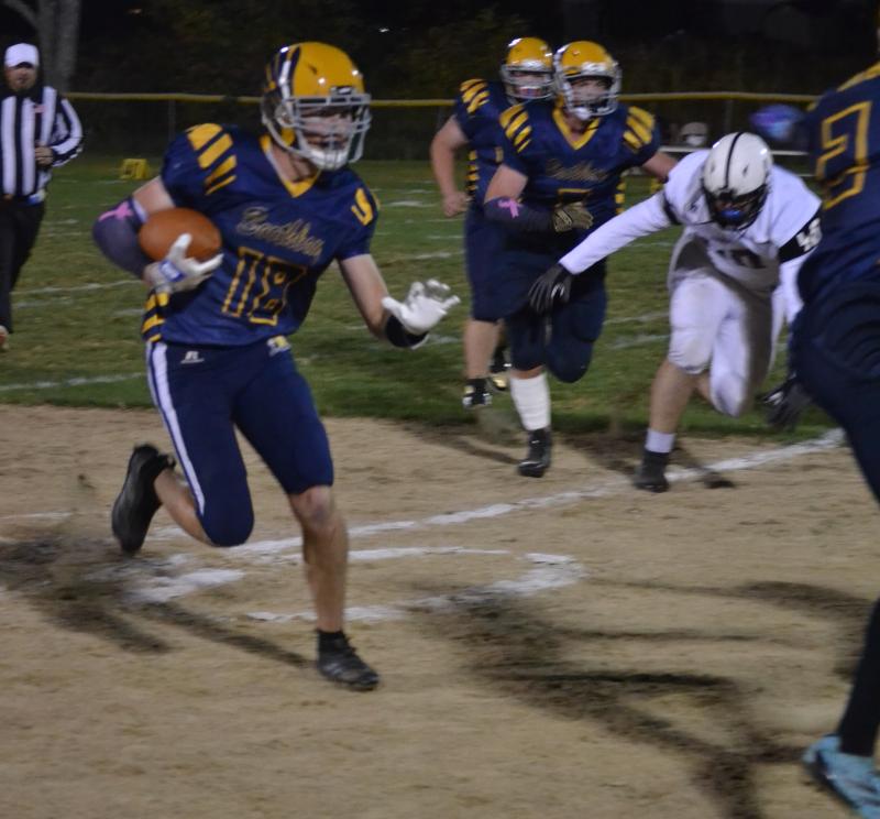 With Boothbay trailing 19-12, defensive back Isaac Fanslau scored on a 40-yard interception return trimming the lead to one. On the play, the Boothbay pass rush moved Raider quarterback Coelho left. Fanslau was one of two Boothbay defenders who moved Coelho out of the pocket. Coelho moved left to avoid the pass rush and backward to avoid Fanslau and another pass rusher.